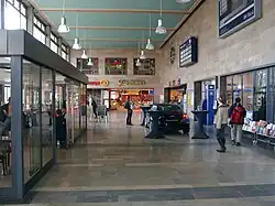Das Empfangsgebäude ist eine 120 m lange Beton-Glas-Konstruktion; an seiner Dachhaut ist ein Kupferband angebracht. Sein mittlerer Teil ist eine 40 m lange, 11,5 m breite und 7,5 m hohe gestreckte Halle mit Glasfront. Der Fußboden der Empfangshalle ist mit Jura-Platten belegt, die Wände sind mit Jura- und Travertin-Platten verkleidet. Die Decke ist eine Rabitzkonstruktion mit Feldern aus blauem Spritzputz.