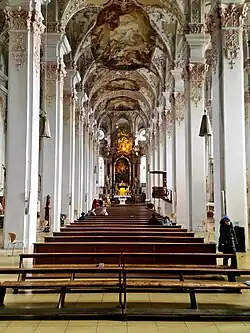 Die festlich geschmückte dreischiffige Hallenkirche erhielt ihre reiche Ausstattung um 1724/30. Der Régence-Stuck wurde von Egid Quirin Asam im Mittelschiff und von Matthias Schmidtgartner in den Seitenschiffen geschaffen. Ehemals zierten die Seitenschiff-Gewölbe Fresken von Nikolaus Gottfried Stuber. Den Stuck im Verlängerungsbau fertigte Georg Biehl. 1953/57 wurde die schwer kriegsgeschädigte barocke Kanzel durch eine moderne ersetzt.