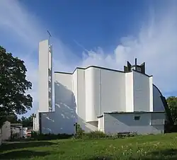 Die Gebäude sind bis auf den Turm aus Ziegelmauerwerk errichtet.[10] Die Kirche ist ein weiß gestrichener Zentralbau mit annähernd trapezförmigem Grundriss, der auf den Altar hin zuläuft. Das Dach ist mit Kupferplatten gedeckt und zur Altarseite hin geneigt. Dort reicht das geschwungene Dach fast bis zum Boden. Der Eingang zur Kirche liegt in einem Vorbau, seitlich versetzt gegenüber dem Altar. An einem Teil der Nordostseite befindet sich eine unregelmäßig gegliederte Fensterfront mit geschwungenen Holzlamellen an der Oberkante. Auf der Nordwestseite befindet sich eine große Fensterfront, deren Scheiben durch Rippen voneinander getrennt sind. Durch sie fällt der Blick auf den hohen, weißen, freistehenden Turm mit frei übereinander gehängten Glocken. Ein unregelmäßig geformtes Oberlicht beleuchtet die seitlich des Altarraums gelegene Taufkapelle.