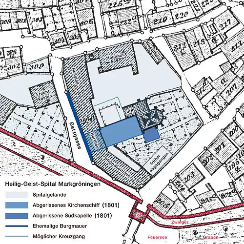 - ↑ Ludwig Heyd: Geschichte des Hospitals zum Heiligen Geist. In: Geschichte der vormaligen Oberamts-Stadt Markgröningen mit besonderer Rücksicht auf die allgemeine Geschichte Württembergs, S. 203–260. Stuttgart 1829, S. 254ff, sowie Spitalkirche zum Heiligen Geist Markgröningen von 1297 bis 1981. 25 Jahre Heilig-Geist-Gemeinde, 28. Juli 1957 bis 28. Juli 1982, hrsg. v. der Katholischen Kirchengemeinde Markgröningen, Markgröningen 1982, S. 70
