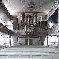 Im Jahr 1621 wurde eine Orgelempore errichtet und wohl die erste Orgel aufgebaut. 1688 wurde das Instrument durch einen Neubau ersetzt und die alte Orgel 1694 nach Einberg veräußert. Das Werk hatte zwei Manuale und wohl 18 Register. Nach mehreren Reparaturen am heruntergekommenen Werk musste das Instrument 1872 durch einen zweimanualigen Neubau der Orgelbauer Köllein und Hasselbarth aus Großtabarz ersetzt werden. Die gegenwärtige Orgel errichtete 1968 der Göttinger Orgelbaumeister Paul Ott. Sie hat zwei Manuale, Pedal und 26 Register. Das neunteilige Orgelhauptgehäuse stammt wohl aus der Zeit um 1735. Es zeigt den rhythmischen Wechsel von Rund- und Spitztürmen mit dazwischengeschalteten Flachfeldern.[2] 1998 wurde die Orgel renoviert.