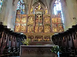Die Kirche besitzt als Retabel einen Flügelaltar mit geschnitzten Reliefs der Passion Christi. In der Predella sind Christus und die zwölf Apostel abgebildet als Bekrönung sind mehrere Heiligenfiguren dargestellt. Der Altar wurde um 1518 vom Colmarer Hans Bongart (auch „Bongartz“ geschrieben) und seinem Meisterschüler Wendelin Steinbrunn geschaffen. Die Außenseiten wurden 1621 von Mathis Wuest bemalt.