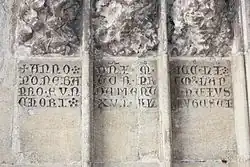 Hier befindet sich der oben erwähnte Grundstein von 1351. Im Tympanon sind in drei übereinander liegenden Feldern Szenen der Passion Christi dargestellt, angefangen vom Gebet am Ölberg über Judaskuss, Gefangennahme, Verhör vor Pilatus, Geißelung, Dornenkrönung, Tragen des Kreuzes, Kreuzigung und Kreuzabnahme. Ganz oben sieht man Jesus in der Unterwelt und anschließend die Auferstehung.