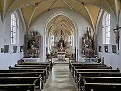 Das Langhaus wird von einem einfachen Netzgewölbe aus birnstabförmigen Rippen überspannt. Dieses ruht zu beiden Seiten auf gefasten Wandpfeilern mit überwiegend profilierten, halben Achteckkonsolen, teilweise auch mit Kopfkonsolen. Der großzügig ausgeführte Chorraum ist seit der Renovierung von 1981 gegenüber dem Langhaus um zwei Stufen erhöht. Er weist ein deutlich aufwändiger gestaltetes Netzgewölbe mit gekehlten und geschrägten Rippen auf. Die Gewölbe in Langhaus und Chor weisen jeweils runde Schlusssteine auf, die Gewölberücklagen wurden 1981 nach Befund aus der Entstehungszeit der Kirche in einem Ockerton gefasst. Den Übergang zwischen Langhaus und Chor vermittelt ein spitzer, beidseits gestufter und gefaster Chorbogen.[4][6]