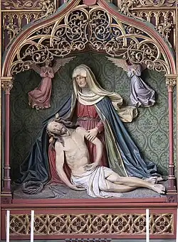 Zu beiden Seiten des Chorbogens befinden sich die neugotischen Seitenaltäre, die den Kastenaltären der Gotik nachempfunden sind und im Jahr 1895 ebenfalls bei den Gebrüdern Goss in Stadtamhof gefertigt wurden. Im linken Altarschrein befindet sich die Darstellung einer Pietà, also eine Mater Dolorosa, die um ihren Sohn trauert. Begleitet wird die Szene von zwei Anbetungsengeln. In die Predella ist ein Tabernakel eingelassen, vor dem ein kostbares Elfenbeinkreuz aus dem 17. Jahrhundert steht. Am rechten Seitenaltar ist die Heilige Familie bei der Arbeit zu sehen. Das Relief in der Predellazone zeigt eine Szene aus dem Alten Testament: die Offenbarung Gottes an Samuel im Tempel.[8]