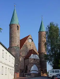 Die Westfassade wird von den beiden Rundtürmen mit Spitzhelm eingefasst, die an den Langhausecken angebaut sind und kaum in das Kirchenschiff einspringen. In der bayerischen Gotik ist diese Bauform einmalig.[7] Möglicherweise wurden die Herzöge Friedrich und Heinrich der Reiche dabei durch ihre verwandtschaftlichen Beziehungen zum Herzogtum Straubing-Holland beeinflusst und haben sich an Bauten wie dem Rittersaal in Den Haag oder der Liebfrauenbasilika in Maastricht ein Vorbild genommen. Beide Gebäude bestanden zur Entstehungszeit der Heilig-Blut-Kirche bereits und besitzen ebenfalls Doppelturmfassaden mit zwei Rundtürmen. Bei der Landshuter Kirche scheinen die beiden Türme nur auf den ersten Blick gleich aufgebaut zu sein. Bei näherem Hinsehen erkennt man, dass der Südturm viermal abgesetzt ist, während der Nordturm nur einen Absatz besitzt. An den Absätzen verjüngen sich die Türme jeweils nur minimal. Daher ist der Südturm am oberen Ende etwas schmäler, allerdings geringfügig niedriger als sein nördliches Pendant. Zwischen den beiden Türmen befindet sich der Dreiecksgiebel des sattelgedeckten Langhauses, der mit einem Ziffernblatt geschmückt ist.[4][6]