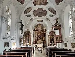 Die Deckenmalereien wurden 1711 im Langhaus und 1717 im Chor von Johann Valentin Reischl aus Waldmünchen in der Oberpfalz ausgeführt. Auf dem Deckenfresko im Chor ist das von Engeln umgebene Jahwezeichen dargestellt.