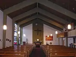 Die von Franz Pauli 1962 entworfenen Buntglasfenster wurden 1970 eingebaut. Der Altarraum wird von einem Hängekreuz dominiert. Am Ambo sind die Buchstaben Alpha und Omega (Α und Ω) dargestellt, der erste und der letzte Buchstabe des klassischen griechischen Alphabets. Sie sind ein Symbol für Anfang und Ende, damit für das Umfassende, für Gott. Der Tabernakel ist mit Ähren und Trauben verziert. An der Westseite sind 14 Kreuzwegstationen angebracht. Die Orgel wurde von G. Kisselbach aus Baunatal erbaut und am 24. Februar 1985 durch Pfarrer Rudolf Marek eingeweiht, sie verfügt über 5 Pfeifenregister und 35 elektrische Register. Zuvor wurde ein Harmonium, ab 1970 eine elektronische Orgel für die Kirchenmusik benutzt. Unter der Orgelempore befindet sich eine Marienstatue, vor der Opferkerzen aufgestellt werden können. Zur Innenausstattung gehören ferner ein Beichtstuhl und ein Taufbecken. Die östlich der Kirche befindliche, aber nur vom Innenraum der Kirche zugängliche Werktagskapelle wird von oben belichtet.