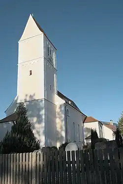 Der Saalbau mit eingezogenem, polygonalem Chor und spätromanischem Westturm wurde Mitte des 18. Jahrhunderts barockisiert. Die Einwölbung des Langhauses erfolgte 1822. Der Chorstuck im Stil der Wessobrunner Schule entstand um 1740. Das Deckenbild im Langhaus von Johann Jaud zeigt das Pfingstwunder. Die beiden klassizistischen Seitenaltäre wurden 1792 von Franz Doll geschaffen.