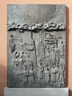 In unmittelbarer Nähe des Brunnens und neben dem Arkadengang samt Haupteingang zum Pfarreizentrum befindet sich seit 2013 die Heilig-Geist-Plastik des Künstlers Hans Loretan (1920–2008),[22] welche zuvor in der Kirche angebracht gewesen war. Diese Bronzeplastik thematisiert vier Werke des Heiligen Geistes: Oben wird der Geist Gottes bei der Schöpfung dargestellt (Gen 1,2), links die Vision des Ezechiel, der berichtet, wie ihn Gottes Hand an den Haaren gepackt und nach Jerusalem gebracht habe (Ezech 8,1ff.). Rechts wird das Pfingstereignis mit der Ausgiessung der Heiligen Geistes gezeigt (Apg 2,3ff.), unten schliesslich die Aussendung der Jünger (Apg 1,8).[23]