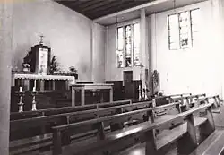 Beim oberen Eingang zur Kirche befindet sich ein Kreuz, das von Künstler Paul Stöckli 1973 geschaffen wurde und die quadratischen Elemente der ursprünglichen Gestaltung des Kirchenraumes aufnimmt.