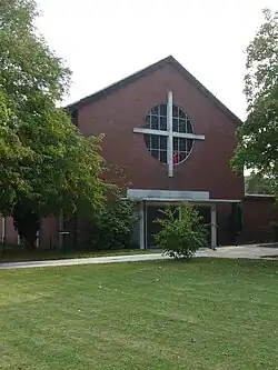 Die in rund 13 Meter Höhe über dem Meeresspiegel gelegene Backsteinkirche wurde nach Plänen der Architekten Josef Fehlig (Hildesheim) und Leo-Karl Golombek (Bremen-Grohn) erbaut, ausgeführt als turmloser Langhausbau. Ein ursprünglich geplanter Glockenturm wurde nicht realisiert.[7] Der Altarraum wurde von einer Kreuzesdarstellung, darüber eine Taube als Symbol für den Heiligen Geist, dominiert.