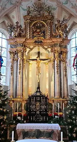 Das romanische Kreuz ist in den Hochaltar von 1611 integriert. Der hölzerne Tabernakel stammt aus dem Jahr 1700; er ist aus dunklem Holz und reich mit Silber verziert. Der rechte der beiden Seitenaltäre von 1620 trägt ein Gemälde von der Himmelfahrt Marias, ein Werk Johann Matthias Kagers; am linken ist die Beweinung Christi dargestellt. Figuren von Christus, Maria, und den Aposteln an den Wänden werden auf 1620 oder 1672 datiert. Die Kanzel stammt aus dem Jahr 1746. Die Bilder der Kreuzwegstationen schuf Wenzeslaus Albert 1769.