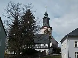 Die spätbarocke, auf einer Anhöhe gelegene Saalkirche wurde in den Jahren 1765–1768 durch Johann Christoph Uhlmann und Johann Gottlieb Ohndorff anstelle eines spätmittelalterlichen Vorgängerbauwerks errichtet. Der Turm wurde 1775 hinzugefügt. Restaurierungen wurden in den Jahren 1822 (außen), 1824, 1896 und um 1965 (innen) durchgeführt.