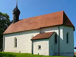Der Innenraum ist mit einer Flachdecke mit Hohlkehle überspannt. Der 1637 gebaute Hochaltar wird von den Skulpturen des Wolfgang von Regensburg und der heiligen Helena unter Baldachinen flankiert. Ein Tabernakel wurde 1758 aufgestellt.