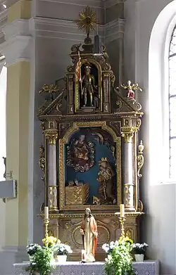 Der Hochaltar vom Ende des 17. Jahrhunderts wurde im Jahr 1745 aus der Mariahilfkirche in München hierher übertragen. Er zeigt ein Gemälde mit einer Darstellung der Pietà unter dem Kreuz, signiert von Franz Seraph Gaulrapp, flankiert von hölzernen Skulpturen des heiligen Dionysius und des Erzengels Michael.