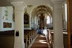 Der Innenraum ist ein spätgotischer Saalbau mit eingezogenem, dreiseitig geschlossenem Chor. Im Zuge der Barockisierung der Kirche wurden im Chor die gotischen Netzrippen abgeschlagen und das Gewölbe mit Stuckdekor aus Fruchtgirlanden, Engelsköpfen und Akanthusranken überzogen. Das Langhaus wird von einer flachen Stichkappentonne gedeckt, die mit Deckengemälden versehen ist. Den westlichen Abschluss des Langhauses bildet eine auf zwei Pfeilern aufliegende Doppelempore.