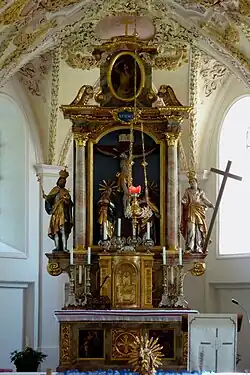 - Der Hochaltar stammt vermutlich aus der Zeit der Barockisierung der Kirche. In der Mitte des Altars steht eine lebensgroße Kreuzigungsgruppe, die seitlichen Figuren stellen Kaiser Konstantin den Großen und seine Mutter, die heilige Helena, dar.