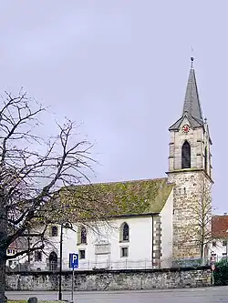 Bereits 1359 wurde erstmals eine Kapelle urkundlich erwähnt. Die heutige Saalkirche besteht aus einem im Osten dreiseitig geschlossenen Langhaus und einem Kirchturm im Westen. 1742 wurde das Langhaus nach Norden verbreitert und eine Empore für die Männer eingebaut. Der Kirchturm, dessen untere Geschosse aus Feldsteinen bestehen, wurde 1879 mit einem neugotischen Geschoss aus Quadermauerwerk aufgestockt und mit einem achtseitigen, schiefergedeckten Knickhelm bedeckt. Im Giebel wurden die Zifferblätter der Turmuhr untergebracht. Im Glockenstuhl darunter hängen vier Kirchenglocken mit den Tönen e″ d″ h′ a′, von denen eine historische aus dem 19. Jahrhundert von zwei Glocken der Firma Otto aus Bremen und einer Glocke der Gießerei Bachert aus Heilbronn ergänzt wird.