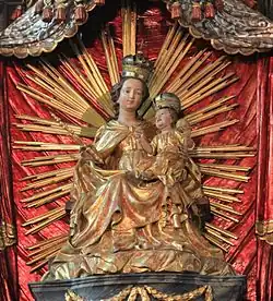 Zur Ausstattung der Kirche zählt unter anderem ein Hochaltar aus dem Jahre 1681. In der Ädikula aus gekuppelten Säulen ist unter einem spätbarocken Baldachin eine um 1420 gefertigte Sitzmadonna mit einem spätbarocken Jesuskind aufgestellt. Die Madonna wird von den gotischen Heiligenfiguren Bartholomäus und Katharina flankiert. Im Altaraufsatzbild sind ein Kelch mit Hostie und ein Kruzifix dargestellt. Links davon steht die Figur des heiligen Laurentius und rechts vermutlich der heilige Stephanus. Bekrönt wird der Altar von einem IHS-Symbol im Strahlenkranz. Der Rokokotabernakel stammt aus dem Jahre 1791. Das Antependium mit Reliefs alttestamentlicher Szenen wird gegen Ende des 18. Jahrhunderts datiert.