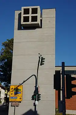Der freistehende Glockenturm, der an der Ecke einer belebten Straßenkreuzung steht, ragt architektonisch aus der Umgebung heraus. Vom Straßenniveau gelangt man über eine Treppe auf den tiefer gelegenen Hof, der den Lärm der Straße ausschließt. Das Innere ist schlicht gestaltet und wirkt, als Kontrast zum direkten Autoverkehr, als ein Raum der Ruhe.[3]