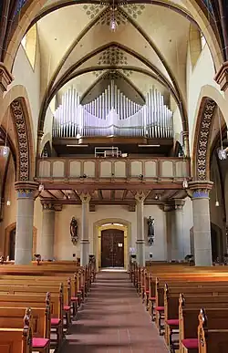 Die Orgel der Kirche wurde 1934 von der Firma Späth Orgelbau (Mengen) erbaut. Die Taschenladen-Instrument verfügt über 15 (17) Register, verteilt auf zwei Manuale und Pedal. Die Spiel- und Registertraktur ist elektropneumatisch. Die Disposition lautet wie folgt:[4]