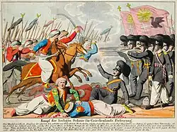 Der erste Aufstand brach in den Donaufürstentümern unter der Führung der geheimen revolutionären Organisation Filiki Eteria aus.[8] Am 22. Februar 1821 führte Alexander Ypsilantis eine Einheit von rund 500 griechischen Freiwilligen, die er in Anlehnung an die antike „Heilige Schar von Theben“ als „Ieros Lochos“ (Heilige Schar) bezeichnete, in Iași, der Hauptstadt Moldaus, ein. Er gab vor, die Unterstützung einer Großmacht (mutmaßlich Russland) zu besitzen, in der Hoffnung auf die Protektion des orthodoxen Zaren Alexander I. Doch dieser, gebunden an die Beschlüsse des Wiener Kongresses, verurteilte den Aufstand öffentlich und entzog Ypsilantis sämtliche militärische Titel. Enttäuscht zog Ypsilantis nach Bukarest, musste jedoch erkennen, dass die orthodoxen Donaufürstentümer (Moldau & Walachei) trotz religiöser Verbundenheit nicht hinter ihm standen – stattdessen strebten sie nach rumänischer Eigenstaatlichkeit.[9]