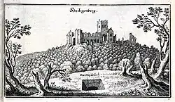 Ab dem 16. Jahrhundert wurde Heidelberg auch wiederholt auf Stadtansichten dokumentiert, die gelegentlich auch genauere Informationen zum Heiligenberg sowie dem dortigen Wald- und Gebäudebestand bieten. Die älteste detailreiche Darstellung des Michaelsklosters durch Matthäus Merian in der Topographia Palatinatus von 1645 zeigt das Kloster schon als Ruine, aber noch mit weitgehend erhaltenen Wänden und dem Vierungsturm.[24] Gleichzeitig hatte durch die Renaissance auch eine erste historische Beschäftigung mit dem Berg begonnen. Der spätere Reformator Philipp Melanchthon studierte 1508 römische Inschriften im Michaelskloster und erwog eine Gleichsetzung des Berges mit dem Schauplatz der spätantiken „Schlacht am Mons Piri“. Im Laufe der folgenden Jahrzehnte wurden mehrere antike Steindenkmäler vom Heiligenbergerg entnommen und in der näheren Umgebung, beispielsweise in Handschuhsheim, aufgestellt. Der Heidelberger Gelehrte Marquard Freher beschrieb in seinem 1599 erstmals erschienenen Werk Origenes Palatinae Teile des Michaelsklosters, die er jedoch fälschlicherweise als römische Befestigungsanlage deutete.[25]