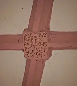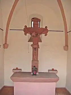 Es handelt sich um ein turmartig anmutendes, nahezu quadratisches Gebäude mit einem Pyramidendach, auf dessen Mittelpunkt ein einfacher Dachreiter mit Glocke und Kreuz sitzt. An der Westseite, vom Friedhof her, ist die Kapelle in einem großen Rundbogen weit geöffnet. Man nimmt an, dass dies ein alter Chorbogen zu einem ehemals westlich vorgelagerten Kirchenschiff ist. Innen besitzt sie ein Kreuzrippengewölbe mit gekehlten Rippen und gerundeten Konsolen. Der einfache Schlussstein trägt die Inschrift: „Jacobus Reben Parochs Posuit 1654“. Im Zentrum steht ein Altar mit gotischer gekehlter Sandstein-Altarplatte. Auf ihr befindet sich ein großes, ausdrucksvolles Sandsteinkreuz mit Korpus, das ins 17. Jahrhundert datiert wird und das älteste des Ortes sein soll. Hinter dem Altar sind zwei Konsolplatten in die Ostwand eingelassen, auf denen früher Holzfiguren standen. Zwischen ihnen findet sich in der Mauer der Rest eines kleineren Christuskörpers (Torso mit Kopf); er scheint gotischen Ursprungs zu sein. An der inneren Nordwand sitzt die Grabplatte von Barbara Hess († 1804). Laut Inschrift war sie die Ehefrau des Oberamtsadvokaten Mauritius Hess und der Grabstein stammt von ihren Kindern, wovon der Sohn Anton Hess Doktor der Theologie und Pfarrer in Neuleiningen gewesen sei. Daneben befindet sich eine Renovierungsinschrift des Ortsgeistlichen Georg Scheurer von 1919.