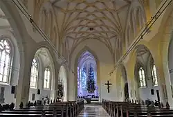 Bei der heutigen Pfarrkirche Heiligenstadt handelt es sich um eine neugotische Pseudobasilika. Im Inneren fällt der erhaltene, gotische Chor auf. Er steht nicht in einer geraden Linie zum Hauptschiff, sondern ist leicht versetzt. Zudem verläuft er leicht schräg. Als Ursache dieser Gegebenheit (Achsknick) werden entweder die Bodenbeschaffenheit oder die Symbolik für das leicht schräg geneigte Haupt Jesus nach dem Kreuzigungstod vermutet. Der Hochaltar, den die oben genannten Architekten gestalteten, zeigt in der Mitte den Kirchenpatron der Pfarre, ein ebenfalls von den Architekten stammender neugotischer Seitenaltar die Heilige Maria. Aus der barocken Umgestaltung der Kirche blieb lediglich jener Seitenaltar erhalten, der dem Heiligen Sebastian geweiht ist. Der ursprüngliche Hochaltar von Matthias Steindl wurde der Pfarre Leopoldau übergeben, das Hochaltarbild von Johann Georg Schmidt wanderte hingegen in das Museum des Stiftes Klosterneuburg. Der Kreuzweg der Kirche ist noch jüngeren Datums. Er wurde 1930/31 von Franz Zelezny gestaltet. Die Hauptpersonen der Passion Christi wurden dabei mit den Gesichtern prominenter Persönlichkeiten (wie Bundeskanzler Seipel) sowie Bewohnern von Heiligenstadt ausgeführt. Der Turm beherbergt ein fünfstimmiges Bronzegeläut, welches gänzlich von der Wiener Glockengießerei Pfundner 1954 gegossen wurde. Die Glocken haben die Töne d´- fis´- a´- h´- d´´.