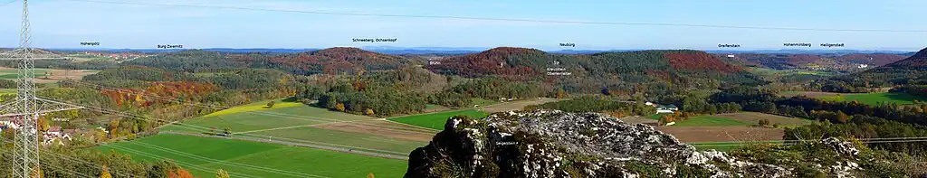 Die Dörfer auf den Anhöhen von Volkmannsreuth bis Teuchatz gehören zur Langen Meile. Mit dem Seigelstein schließt sich bei Lindach der Nordjura an.