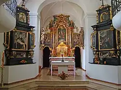 Der 1892 restaurierte Hochaltar mit Rokoko-Ornament wurde um 1770 errichtet und 1771 von Franz Wolfart gefasst. Das Altarblatt aus dem Anfang des 18. Jahrhunderts zeigt die Darbringung Mariens im Tempel durch die hll. Joachim und Anna. Einige Engel des Hochaltars wurde 1973 gestohlen. Die mit Knorpelwerkornament verzierten Seitenaltäre stammen aus der Bauzeit. Auf dem linken Seitenaltär steht ein Bild einer Pietà und auf dem rechten eine Bildn der Kreuztragung. Die seitlichen Wangen der Seitenaltäre weisen Bildfelder auf. Die 1971 restaurierte und 1781 sowie 1849 reparierte Positivorgel stammt aus dem Anfang des 18. Jahrhunderts. Die Kreuzwegbilder folgen der barocken Tradition. In der Sakristei findet man die Reste von zwei barocken Fresken, welche eine Pietà sowie einen Schmerzensmann zeigen, sowie einen kleinen barocken Schrank mit gemalten Leidenswerkzeugen.[2]