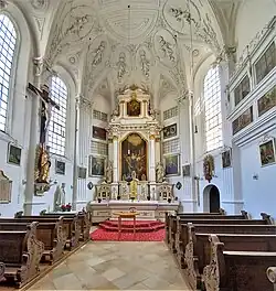 Der Innenraum ist mit einem Tonnengewölbe überspannt, das auf korinthischen Pilastern aufsitzt. Die Stuckaturen werden Hans Kogler zugeschrieben. Der Hochaltar wurde 1793 aufgestellt. Auf seinem Altarretabel ist die Ausgießung des Heiligen Geistes als Ikonografie von Pfingsten dargestellt.