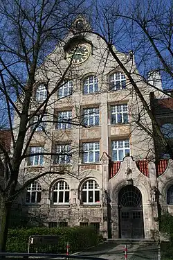 Das langgestreckte Schulgebäude ist ein Jugendstilbau. Es weist einen unregelmäßigen dreiflügeligen Grundriss auf und besteht aus dem dreieinhalbgeschossigen Hauptflügel, der zurückgesetzt, parallel zur Straße angeordnet ist und aus zwei unterschiedlich langen Seitenflügeln sowie der Turnhalle.