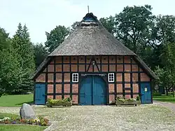 Das eingeschossige ehemalige Wohn- und Wirtschaftsgebäude steht zentral auf der Hofstelle im Wald. Das Zweiständer-Hallenhaus in gleichmäßigem Fachwerk mit Steinausfachungen, mit reetgedecktem Krüppelwalmdach als Niedersachsengiebel mit Uhlenloch und der Grooten Door mit Korbbogen wurde 1781 (Inschrift) als Haus des Waldvogtes von Wachholz gebaut. Die Innenkonstruktion mit Luchtbalken (Unterzug) und Flett-(Küche)Dielengrundriss ist erhalten.[1]