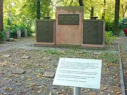 Die Grab- und Gedenkanlage auf dem Friedhof Friedrichsfelde befindet sich links hinter der Gedenkstätte der Sozialisten und erinnert in ihrer Form an den Grundriss eines Schiffes. Ihren hinteren Abschluss bilden drei aufrecht stehende Gedenksteine aus rotem Porphyr, die drei Bronzetafeln tragen. Auf den seitlichen Tafeln stehen die Namen und Geburtsdaten von fünfzehn Mädchen, dreizehn Jungen und zwei Frauen. Die ursprünglichen, mit der Zeit verwitterten Tafeln wurden zum 4. Mai 1994 mit dem etwas verändertem Widmungstext „Dem Gedenken der Toten vom 5. Juli 1951“ erneuert.[2][3] 2011 wurde am Rand des Gräberfeldes eine erläuternde Informationstafel enthüllt und die 16 Kissengrabsteine restauriert. Die restlichen 14 Verunglückten sind auf anderen Berliner Friedhöfen beerdigt worden.[4]