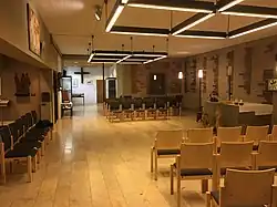 Der helle schlichte Innenraum wird außerdem beleuchtet durch den hoch liegenden Fries farbiger Fenster an den beiden Längsseiten der Kirche und ein weiteres Glasfenster in Chorhöhe, das die gesamte Höhe des Raumes und fast ein Viertel seiner Länge einnimmt. Die Ikonographie der Fenster variiert das Thema Krieg und Gefangenschaft. Die Kriegerstraße zeigt, stilisiert, Erinnerungen an den Seekrieg, brennende Häuser, symbolisch eine Sense, Auswirkungen einer Bombe, Feuer, Flieger und Kanonenrohre.[6]