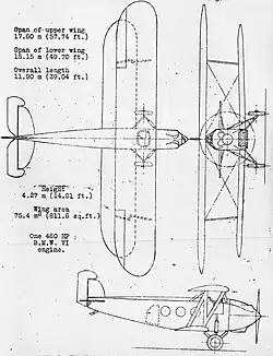 Das Tragwerk ist aus Holz gearbeitet und aus zwei Kastenholmen, Sprucegurten und Sperrholzstegen gebildet. Zwischen den Holmen besteht die Beplankung ebenso wie die Flügelvorderkante aus Sperrholz, der übrige Teil ist mit Stoff bespannt. Ober- und Unterflügel sind durch N-Stiele miteinander verbunden. Die untere Tragfläche weist eine leichte V-Stellung von 2° auf. Im Oberflügel ist der Kraftstofftank mit einem Fassungsvermögen von 700 Litern untergebracht. Das Leitwerk besteht aus mit Stoff bespannten Stahlrohrrahmen und besitzt ausgeglichene Ruder und eine im Flug verstellbare Höhenflosse.