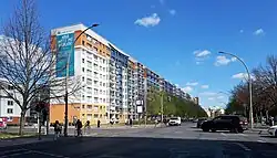 Nach der Einführung der Plattenbauweise, die vor allem in Bebauungsgebieten aus größeren zusammenhängenden möglichst unbebauten Flächen effektiv angewendet werden konnte, wurde das Heine-Viertel in den Jahren 1959–1961 am südlichen Ende der Straße direkt an der Grenze zu Kreuzberg mit Bauten des Typs Q3A errichtet. Später wurde der restliche nördliche Teil dieser Straße, der ab Heine-Viertel in Richtung Köpenicker Straße verläuft, ebenfalls mit Großblockbauten versehen.