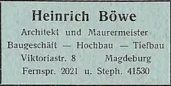 Sein Baugeschäft hatte später in den 1920er Jahren seinen Sitz in der Viktoriastraße 8 in der Magdeburger Innenstadt, während Böwe selbst in Buckau in der Schönebecker Straße 39 wohnte.[8]