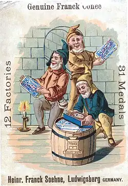 In Ludwigsburg wurden in den Jahren 1868 und 1869 Neubauten geschaffen; außerdem im Laufe der Zeit auch Werke im Ausland. Für den österreichisch-ungarischen Markt wurde 1879 eine Niederlassung in Linz eröffnet, die sich unter Carl Franck verselbständigte und sich im Laufe der Zeit zur größten Kaffeemittelfabrik der Habsburgermonarchie entwickelte.[2] Weitere Niederlassungen waren 1883 im böhmischen Komotau, in Mailand und in Basel, 1899 in Raschau in Böhmen, 1890 in Bukarest, 1892 Filiale in Zagreb, 1895 in Flushing in New York, 1897 im böhmischen Pardubitz, 1899 im bilogorischen Bjelovar, 1909 im ungarischen Nagykanizsa etc. Wichtig war insbesondere auch der Bau der Fabrik in Halle an der Saale, der den Transport der Zichorienwurzeln von der Magdeburger Börde nach Ludwigsburg überflüssig machte. Die 1913 in Neuss am Rhein erbaute Fabrik produzierte Getreidekaffee, der als „Kornfranck“ vermarktet wurde.[1] Von 1871 bis 1914 firmierte das Unternehmen unter dem Namen Heinrich Franck Söhne OHG, danach wurde es in eine GmbH umgewandelt.[3]