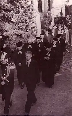 Am 23. September 1943 konnte Heinrich Pröhle sein 50-jähriges Ordinationsjubiläum in geistiger und körperlicher Frische begehen. Das Heilige Abendmahl wurde ihm an diesem Tag von seinem Amtsbruder und Freund Senior Carl Eugen Schmidt (1865–1948) gereicht. Der Zweite Weltkrieg und dessen Folgen ging auch an der Deutschen Evangelischen Kirchengemeinde Preßburgs nicht spurlos vorbei. Der größte Teil der dort lebenden Deutschen (und Ungarn) wurde anhand der Benesch-Dekrete[8] ausgesiedelt und musste das Hoheitsgebiet der wieder restaurierten Tschechoslowakei verlassen.