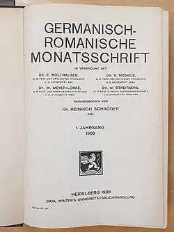 Germanisch-Romanische Monatsschrift. Carl Winter, Heidelberg, 1909–1936. Zunächst 12 Hefte, später 6 Hefte pro Jahr. ISSN 0016-8904