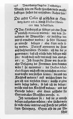 Das Buch Hochnötige Unterthanige Wemütige Klage Der Frommen Unschültigen des Amsterdamer Kaufmanns Hermann Löher von 1676 gibt z. B. auf S. 246 ein Verhör des damaligen Hirschberger Richters Heinrich von Schultheiss von 1616 wieder, der eine Angeklagte, die Wintersche, verhört und dabei Antworten suggeriert. Mit dieser Angeklagten hat sich der Hirschberger Pfarrer Michael Stappert unterhalten und diese Aufzeichnungen gemacht.