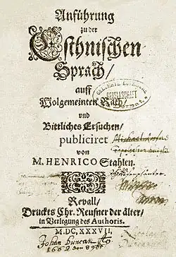 - ↑ Raimo Raag: Henricus Stahell: Geistlicher und Sprachkodifizierer in Estland. In: Klaus Garber, Martin Klöker (Hrsg.): Kulturgeschichte der baltischen Länder in der frühen Neuzeit. Niemeyer, Tübingen 2003, S. 338.