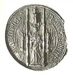 An einer Urkunde vom 3. März 1454[6] hing an einem aus Membran geschnittenen Siegelband ein parabolisches Siegel von grünem Wachs. Die Darstellung auf demselben ist die Krönung Mariä und darunter ein betender Mönch.