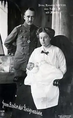Prinz Heinrich XXXIII. Reuß-Köstritz heiratete am 17. Mai 1913 im Neuen Palais in Potsdam Prinzessin Viktoria Margarete von Preußen (* 17. April 1890 in Potsdam; † 9. September 1923 im Jagdschloss Klein Glienicke), Tochter von Prinz Friedrich Leopold von Preußen und Prinzessin Louise Sophie von Schleswig-Holstein-Sonderburg-Augustenburg. Aus der Ehe Heinrichs mit Viktoria Margarete gingen zwei Kinder hervor: