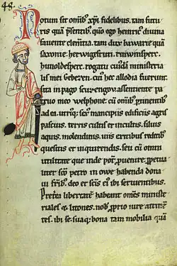 Die Zukunft des sächsischen Herzogtums wurde auf einem Hoftag in Gelnhausen Ende März 1180 geregelt. Heinrich der Löwe wurde als Majestätsverbrecher verurteilt und seine Reichslehen wurden eingezogen. In der für den Erzbischof Philipp von Köln ausgestellten Gelnhäuser Urkunde[95] werden die Vorwürfe, die zur Verurteilung führten, aufgelistet: die Unterdrückung der Freiheit (libertas) der Kirchen Gottes und der Adligen, die Missachtung der nach Lehnrecht ergangenen dreimaligen Ladung vor das Hofgericht und die mehrfache Verachtung der kaiserlichen Majestät (pro multiplici contemptu nobis exhibito).[96] Als Nutznießer dieses Konfliktes erhielt Erzbischof Philipp von Köln am 13. April 1180 das westliche Sachsen als neu geschaffenes Herzogtum Westfalen-Engern. Der östliche Teil fiel an Graf Bernhard von Anhalt, der Herzog von Sachsen wurde. Ende September 1180 wurde auf einem Hoftag in Altenburg auch über das Herzogtum Bayern entschieden. Die Steiermark wurde zum Herzogtum erhoben und dem bisherigen Markgrafen Ottokar von Steier verliehen, Graf Berthold IV. von Andechs erhielt die Herzogswürde für Meranien. Mit dem verkleinerten Herzogtum Bayern wurde der bisherige bayerische Pfalzgraf Otto von Wittelsbach belehnt; die Wittelsbacher regierten in Bayern fortan bis 1918. Mit der Teilung Sachsens und Bayerns ging die Geschichte der großen karolingerzeitlichen regna des ostfränkischen Reiches endgültig zu Ende; an ihre Stelle traten fürstliche Herrschaftsbereiche, von denen sich einige zu Landesherrschaften entwickelten. Die Neuordnung begrenzte aber auch die Königsgewalt und begünstigte sowohl in Bayern als auch in Sachsen regionale Adelsdynastien.[97]