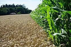 - Dreimal sparrenweise geteilt von Grün und Weiss, belegt mit schwarzem Pfahl mit gelber Ähre
