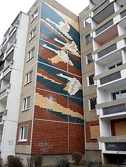 - Flug der Schwäne (1983/1984; zweiteiliges Wandbild an Wohnhäusern; Halle, Johann-Sebastian-Bach-Straße)[3]